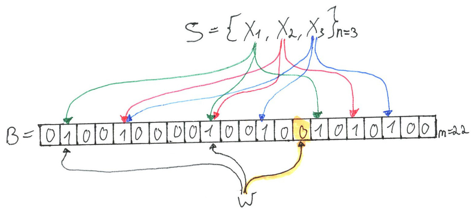A Bloom filter represents a set of elements by an array of bits (initially set to ). Lets call it .